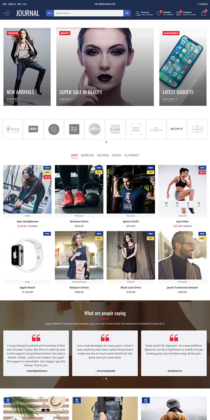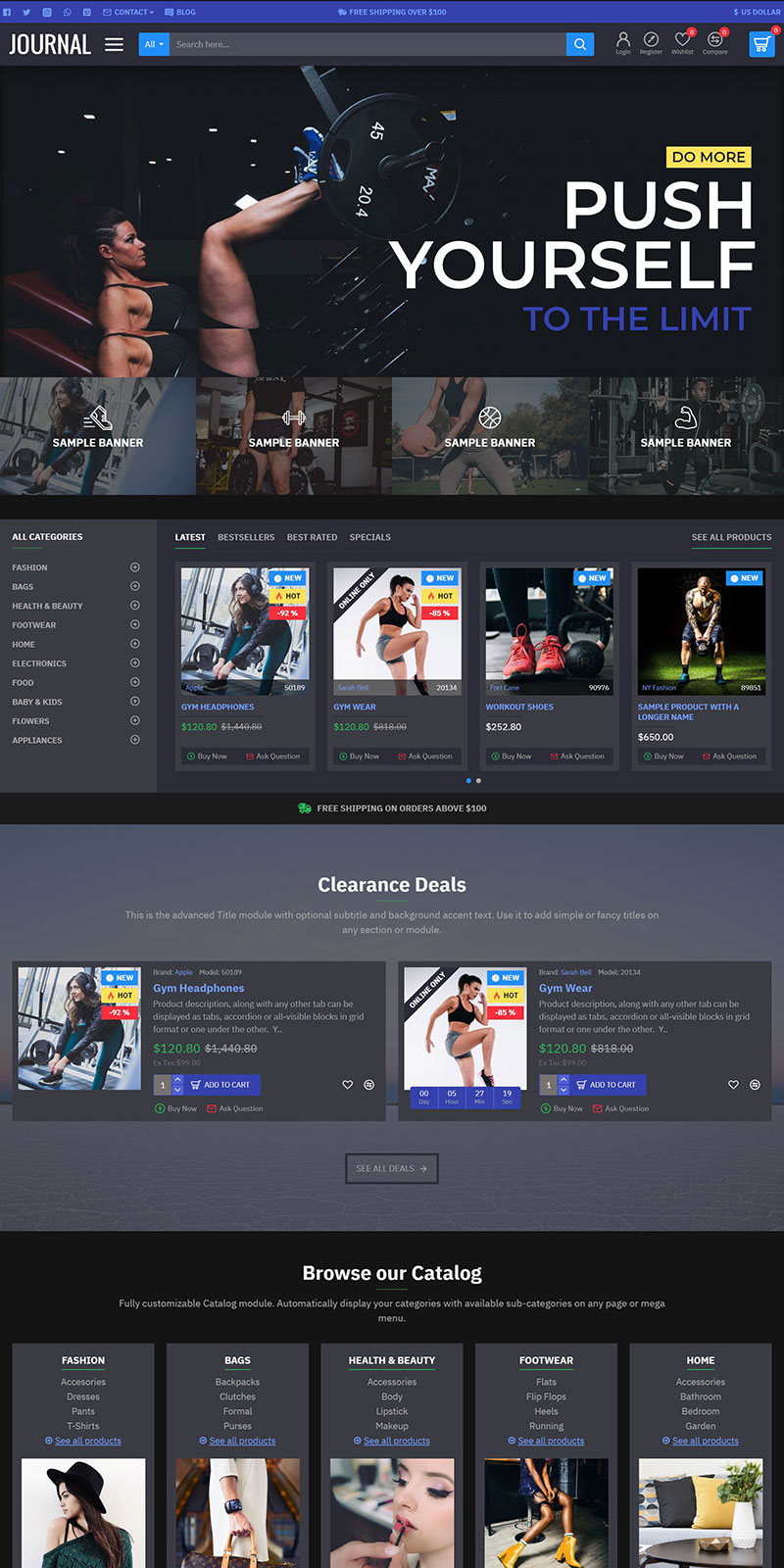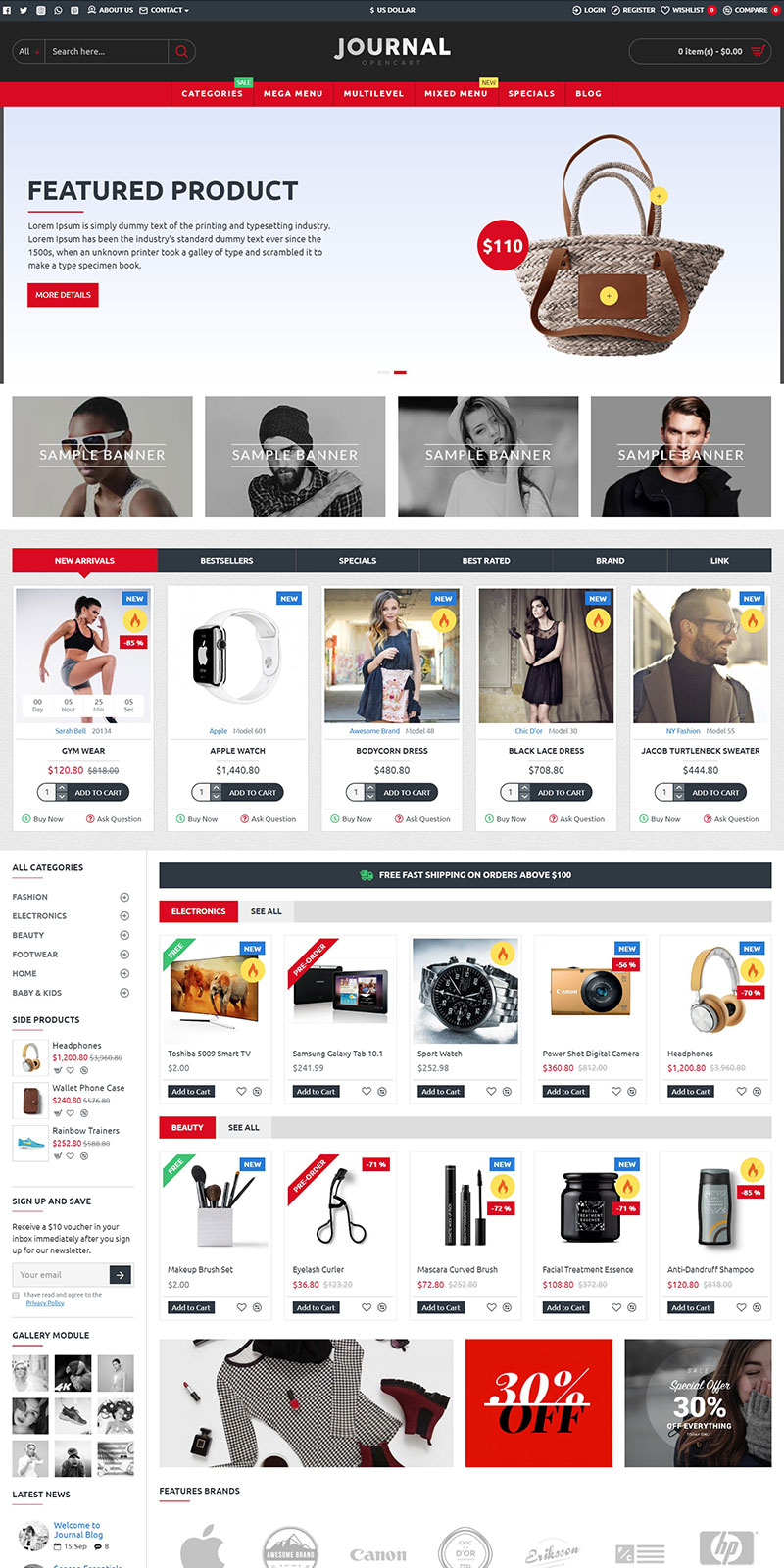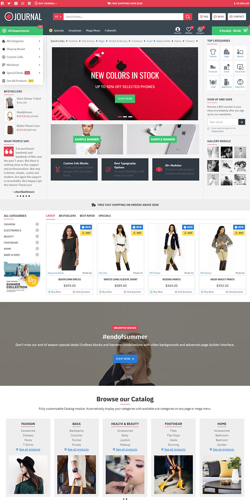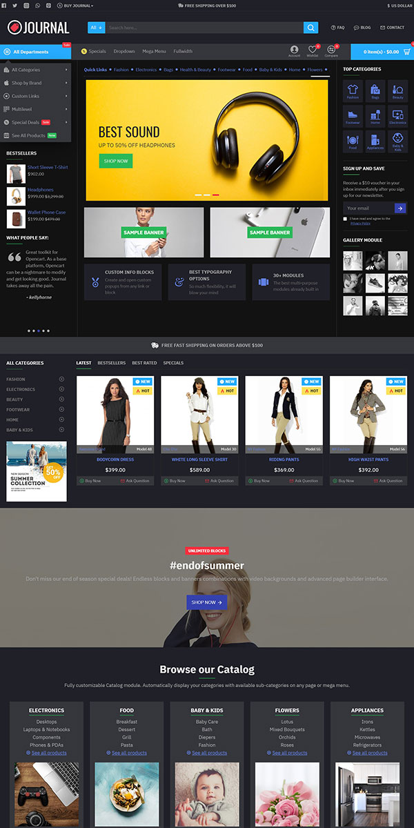 所有版型都可以再自行調整設定,包括隱藏或移動某些區塊、改變配色、字體大小、圖示、文字標題等等。國內已有超過 100 家以上的電商網站,採用了 OpenCart + Journal 版型,請參考 24H.cc 電商便利中心,如果您對 Journal 版型有興趣,可至 Envate Market 購買 Journal Theme 的合法版權,一套 Journal 版行只需要 59 美金(大約台幣1,600多),賣場連結是 : https://1.envato.market/OpenCart-Journal-Theme 。